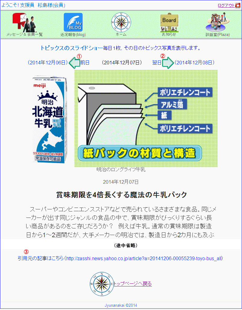 この矢印又は日付をクリックすると前日のトピックスが表示されます。